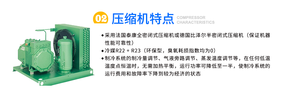 壓縮機: 1,采用法國泰康全密閉式壓縮機或德國比澤爾半密閉式壓縮機(保證機器性能可靠性) 2,冷媒R22 + R23(環保型,臭氧耗損指數均為0) 3,制冷系統的制冷量調節、氣液旁路...